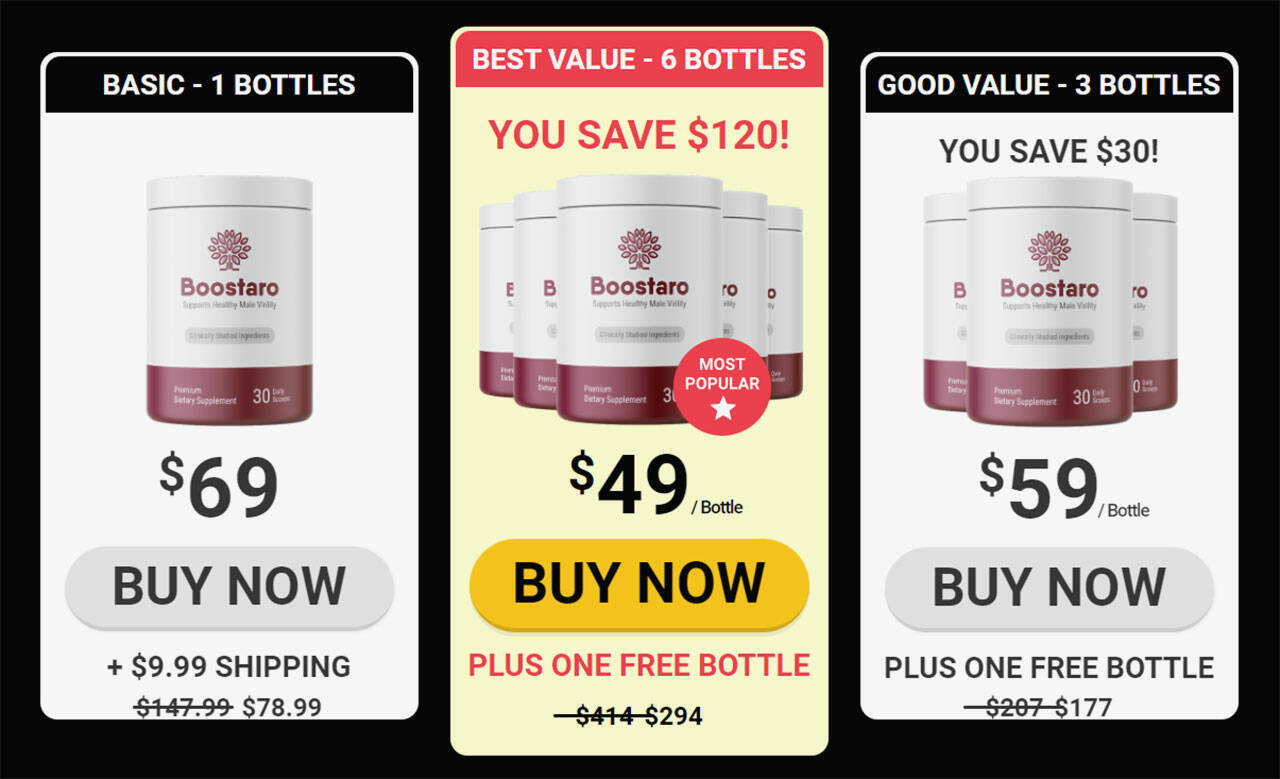 - Buy three bottles of Boostaro: $177 + No shipping cost