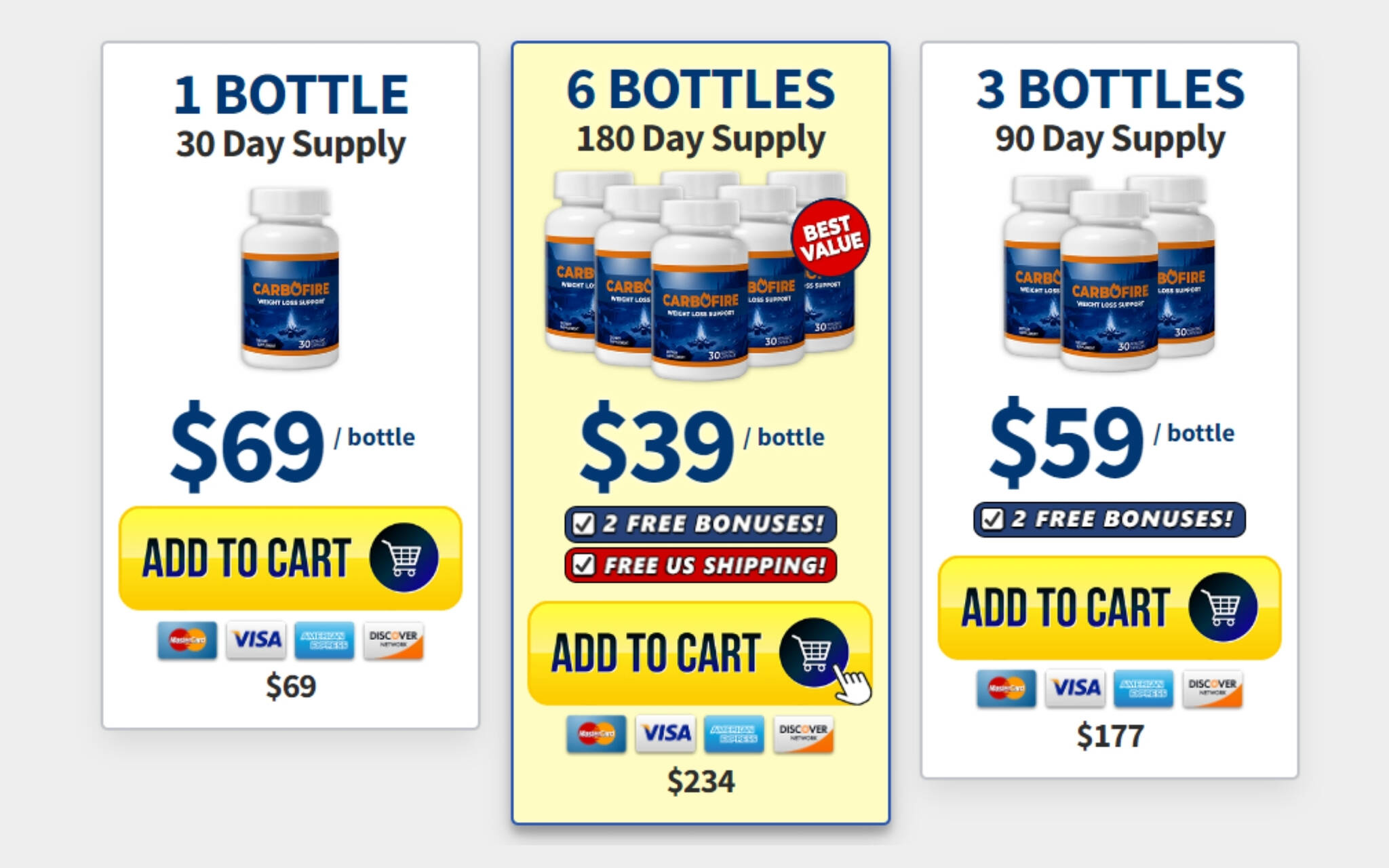 The number of bottles to order depends on your weight loss goals and the duration you wish to use CarboFire. Most customers choose the 6-bottle package for optimal results over an extended period.