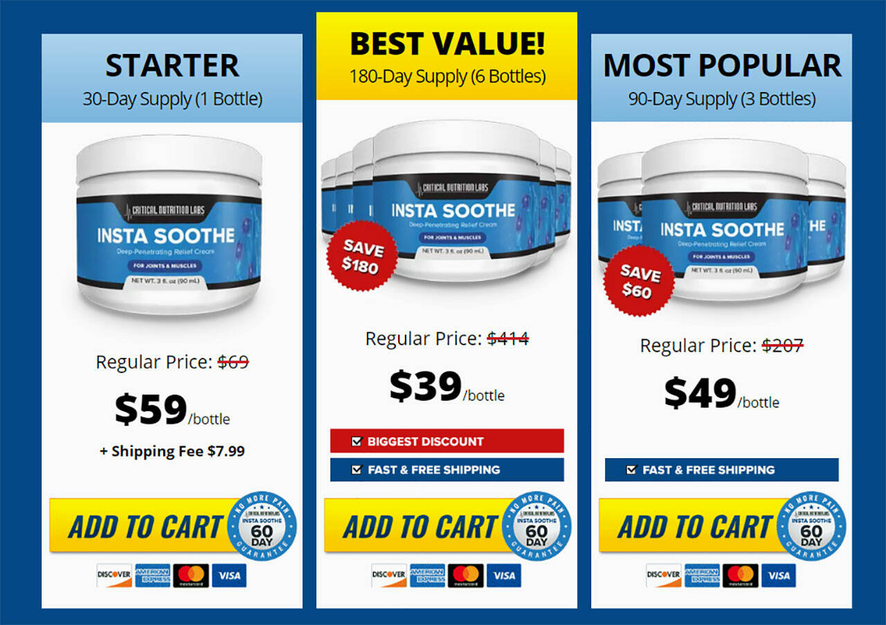 Insta Soothe is typically priced at $69. However, you can save money and qualify for free shipping when buying one or more bottles of Insta Soothe online today.